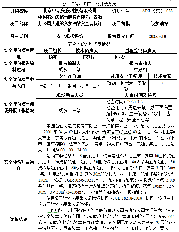 中国石油天然气股份有限公司青海分公司大通第六加油站安全现状评价