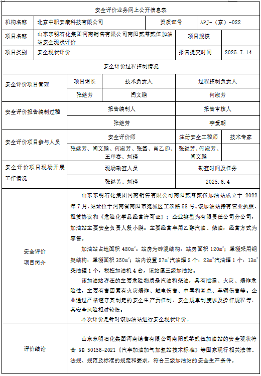 山东东明石化集团河南销售有限公司南阳贰零贰伍加油站安全现状评价2025
