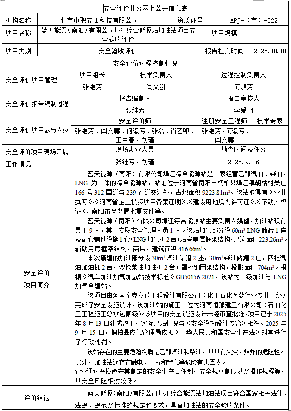 蓝天能源(南阳)有限公司埠江综合能源站加油站项目安全验收评价