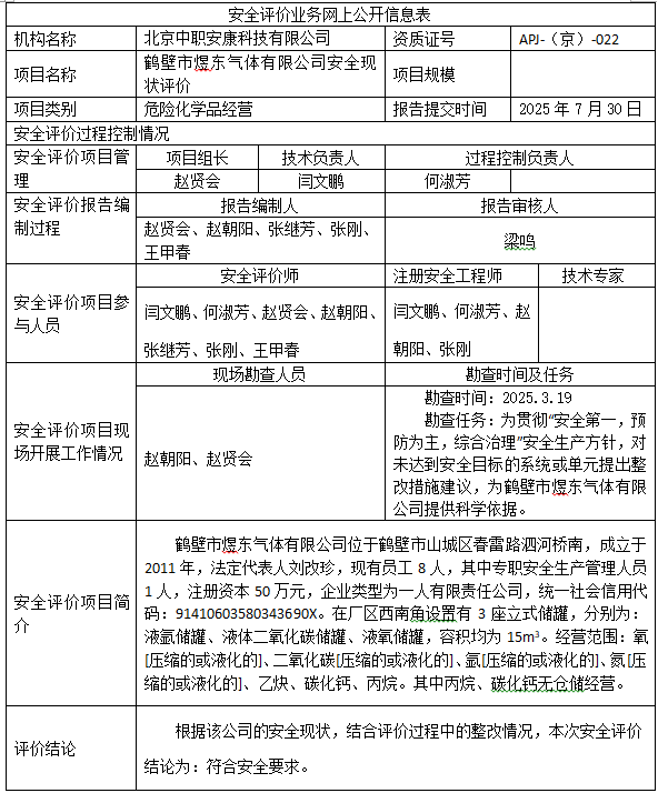 鹤壁市煜东气体有限公司安全现状评价2025