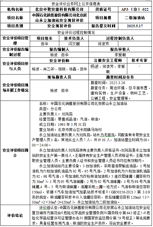 中国石化销售股份有限公司北京房山永立加油站安全现状评价